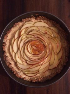 Je kan de appelplakjes tot kleine roosjes rollen en zet deze met de rode schil omhoog in de custard. Als dat niet goed lukt, veeg dan je tranen weg met een stukje keukenrolpapier, en maak er 1 grote bloem van (zie foto). Vul hiermee de hele bovenkant van de taart.