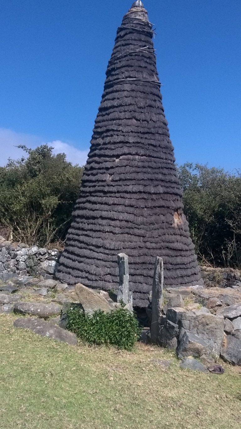 When I visited the village, I was allowed to enter the meadow (first taking off my shoes of course) and to go right up to this strange conical structure. Normally women are not even allowed in the vicinity of this temple. Made of layers of grass-like fibre it towered about 12 meters. Apparently, the fibre was not local and was brought from afar especially for the temple. There was a single entrance. I was told that there was a special ceremony held only once every 12 years. The Priest who officiated was called the “Holy Milkman”.