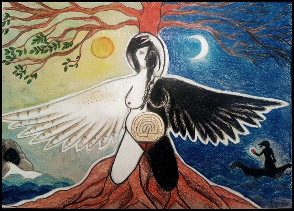 De hybride slang-en-vogel-godin ging over het continuüm van leven, de godin van geboorte, dood en wedergeboorte; Ze creëerde en vernietigde, Ze was de Maagd, de Moeder en de Oude Crone en de godin in de bloei van haar leven die de liefde bedreef met de jonge godheid in het Heilig Huwelijk; de Hieros Gamos, en daarna de Schepping voortbracht. Het kind dat geboren wordt, het Goddelijk kind, wordt later haar minnaar waarmee ze opnieuw het Heilig Huwelijk voltrekt. Daarna sterft haar minnaar, de vegetatiegod, en daalt af naar de onderwereld om weer herboren te worden in het diepst van het donker: op de avond van Midwinter; het Zonnekind, het nieuwe, heilige leven.
