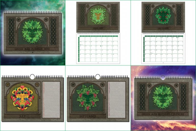 Tijdens mijn opleiding “moest” ik een keer symbolen verzinnen voor de 8 jaarfeesten. Omdat ik van origine qua beroep DTP’er/grafisch vormgever ben, ging ik bij deze opdracht nogal uit mijn dak. Een fantastische opdracht geheel in mijn straatje. Sinds deze opdracht heeft er bij mij een creatieve explosie plaatsgevonden. Een explosie die ervoor gezorgd heeft dat ik een webshop voor paganisten ben begonnen met als uitgangspunt hekserij. Al het drukwerk in mijn webshop heb ik zelf ontworpen en gemaakt. Door “toevalligheden” ben ik op het idee gekomen om een Green Man verjaardags- en maandkalender te maken.