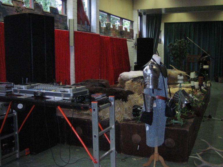 Mijn man ging de zelfgemaakte hapjes en drankjes coördineren en ik ging me bezighouden met de aankleding van de feestruimte. Met een auto en aanhanger vol spullen (schandpaal, koperen ketels, geraamten, schedels, strobalen, kleden) togen wij naar de feestlocatie. Mijn man had het de afgelopen weken druk gehad met het coördineren van wie wat ging maken, en wat was er een hoop! En wat was het allemaal lekker!! In de middag arriveerde Omnia, toen nog met z’n drieën. Wij kenden hen al een tijdje en troffen elkaar op veel festivals waar wij vrijwilligers waren. Ik heb toen nog de merchandise voor hen verkocht, die avond. Al met al was het een geslaagd feest daar in Lunteren.