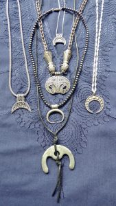 Ryanne droeg een opvallend sieraad. Het zag eruit als een lunula (‘maantje’, in dit geval een hanger met naar beneden wijzende punten), met daarboven een horizontale staaf eraan bevestigd met twee kleinere verticale staafjes. Het geheel deed enigszins denken aan een Chinees teken, of een mens in wijdbenige hurkhouding met opzijgestrekte armen. Ik heb helaas nergens informatie over het sieraad kunnen vinden.
