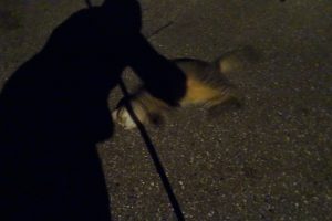 Als ik over de brug naar het buitengebied ben gegaan en naar de driesprong loop, zit daar een poes in het schijnsel van de straatlantaarn. Ze loopt niet weg, dus ik roep ”Kroelie!” en jawel, ze valt om 🙂 Mijn ‘epileptische’ katje (omdat ze steeds omvalt als ze mij ziet) heb ik nog nooit zover van huis getroffen. Ze laat zich met graagte aaien en het liefst over haar buikje, vandaar dat ze alvast gaat liggen 🙂 Ze loopt daarna een stukje met me mee, maar haakt na zo’n 50 meter af. Mijn weg voert natuurlijk naar Uriël, mijn kleine boomvriend. Hij is er nog steeds maar ziet er wat miezerig uit. Eén takje, van de zeven, is kaal en zijn blaadjes zijn klein. Het is natuurlijk heftig weer en waarschijnlijk heeft hij geen flink wortelstelsel. Weliswaar staat hij aan het water, maar dat zegt niet alles. Toch krijg ik een mooi woord van ‘m. Als ik zijn stammetje omvat, boven zijn plastic wokkel, krijg ik ‘voltreffer’. Ik moet aan voetballen denken… nee, daar zal ik het waarschijnlijk niet moeten zoeken. Ik herhaal het een paar keer hardop om het te onthouden, voltreffer… mooi woord.