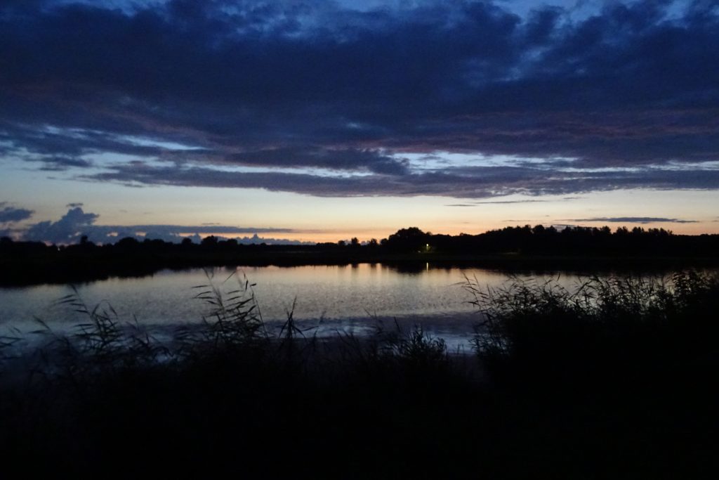Vandaag, 3 augustus, heeft het gehoosd!! Een gigantisch regenfront is over ons land getrokken en bij ons in Zwolle is het flink los gegaan. 15 millimeter regen in korte tijd, wat een verademing! En dan is het gelukkig weer droog in de loop van de avond. Het wordt weer helder en de maan komt op. Mijn schoenen aan en mijn staf mee. De maan is nog niet te zien als ik de deur uitstap. Het is al flink schemerig en ik kan nog net een foto maken van de plas, de weerspiegeling van de lucht maakt dat ik nog net genoeg licht heb. Wat woon ik hier toch mooi. Binnen een half uur loop ik het bos in. Zo ook vandaag. Geen mens op de been en in de tuinen is het stil, alles is nog nat. Het water in de sloten staat hoog en de waterlelies staan in volle bloei. De ganzen zijn stil, geen nestplaats of jongen meer te verdedigen, wat een rust! Af en toe scheert er een vleermuis over het water. Wel moet ik heel goed oppassen waar ik mijn voeten neerzet… slakken! Volgens mij heb ik er niet een geplet op mijn wandeling. Zij zorgen voor de focus en laten het tempo zakken 🙂