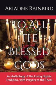 BIO: Ariadne Rainbird is a psychologist, Pagan chaplain, Wiccan, Druid and Orphic practitioner living in Wales. She co-authored Magick Without Peers with David Rankine, and has contributed articles, poetry and artwork to a number of anthologies published by Bibliotheca Alexandrina, mainly on Hellenic deities, as well as written a number of published magazine articles in Pagan journals. Her new book To All the Blessed Gods, an Orphic Anthology is now available on Amazon. She also produces artwork and prayer cards which she sells in her Etsy shop Ariadneswebcreations.