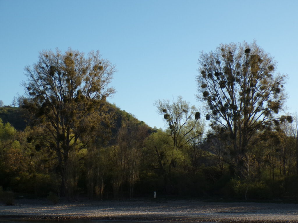 In grote delen van België en in Nederland is maretak heel zeldzaam, behalve in delen van Limburg, hij groeit namelijk alleen op bodems met kalk. Als je vanaf de Nederlandse grens de Rijn opvaart zie je dat hij in dat deel van Duitsland allesbehalve zeldzaam is. In de winter en het vroege voorjaar kun je soms een hele kilometer lang heel veel bomen zien waaraan de bolvormige struiken goed zichtbaar zijn aan de kale takken (zie de afbeelding hieronder). In het zonlicht is dan duidelijk te zien dat de plant groene bladeren heeft, van dichtbij zie je dat die dik en leerachtig zijn. De stengel “is min of meer rond, groen van kleur, gevuld en verdikt onder de knoop waar hij zich in tweeën splitst. Op de eerste stengel en verder op ieder volgend stengeldeel (of stengellid) ontstaat zo steeds een gaffelvormige vertakkingiv“. (Vergelijk met de takken van de esdoorn). De plant is tweehuizig, wat betekent dat de ene struik alleen mannelijke bloemen heeft (met stuifmeel) en de andere alleen vrouwelijke bloemen (met stempel waaruit vruchtbeginsel en vrucht, bes, kunnen groeien).