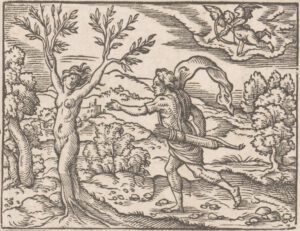 Virgilius Solis: Daphne verandert in een laurierboom. Illustratie bij: Johannes Posthius: Tetrasticha in Ovidii metam. Frankfurt am Main: Georg Rab en Sigmund Feyerabend en erven Weigand Han (1569). Collectie Rijksmuseum