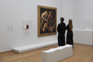 Twee mensen kijken in het Rijksmuseum naar het schilderij Chaos, of De strijd van de Vier Elementen van Louis Finson. Links van het schilderij is in een vitrine een kleine ruimtelijke weergave van dit schilderij te zien, in 1663 gesneden uit buxushout door Jan Pietersz Beelthouwer. Het ‘ei’ met vaag menselijke trekken in de vitrine rechts op de foto is het werk Promethée van Constantin Brancusi, uit 1911 en verwijst mogelijk naar de rol van Prometheus als schepper van de eerste mensen. Foto © Rijksmuseum/Albertine Dijkema