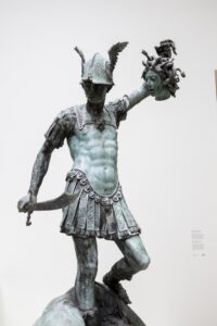 Perseus die het hoofd van Medusa heeft afgehakt (1585-1590). Bronzen beeld van Hubert Gerhard, gemaakt voor een fontein voor hertog Albrecht V van Beieren in München. Uit Medusa’s hals (op deze foto niet zichtbaar) kon water stromen. In de tuin om de fontein heen stonden beelden, alsof die zojuist door Medusa’s aanblik waren versteend. Foto © Rijksmuseum/Albertine Dijkema
