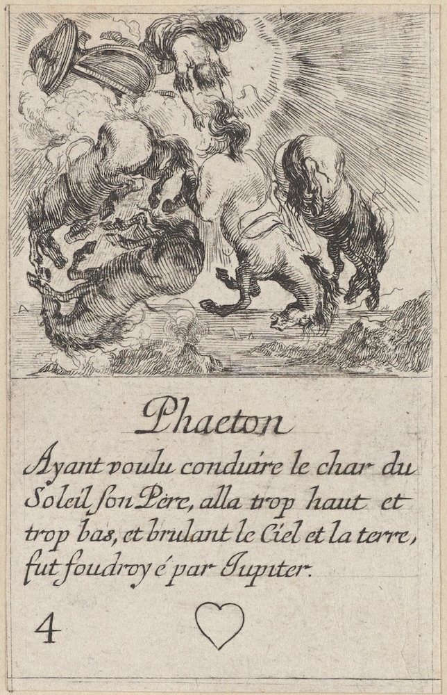Phaëthon reed met de zonnewagen te hoog en te laag, waardoor hemel en aarde verschroeiden, en werd door Jupiter neergebliksemd om verdere rampen te voorkomen. Harten vier uit een kaartspel met voorstellingen uit Ovidius’ Metamorfosen (1620 – 1664). Collectie Rijksmuseum