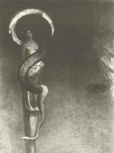 Odilon Redon: Slangenaureool (1890). De vrouw “is een soort antichrist. (…) De prent past in de sfeer van Là-Bas, het boek dat Joris-Karl Huysmans klaar had in hetzelfde jaar. Redon correspondeerde met de schrijver”, meldt de toelichting van het Rijksmuseum