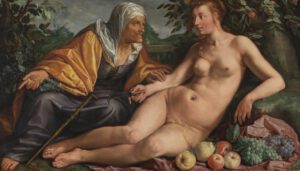 De populaire afbeeldingen beïnvloedden ook de manier waarop Bijbelse verhalen werden geïnterpreteerd en afgebeeld. In het Bijbelverhaal over David en Batseba (haar naam kan ‘dochter van overvloed’ betekenen, lees ik op Wikipedia) komt geen oude vrouw voor, maar in hun weergave plaatsten schilders er vaak wel een oude vrouw bij. Die ontleenden zij aan Ovidius’ verhaal over de oogstgod Vertumnus, die hevig verliefd was op de fruitgodin Pomona: