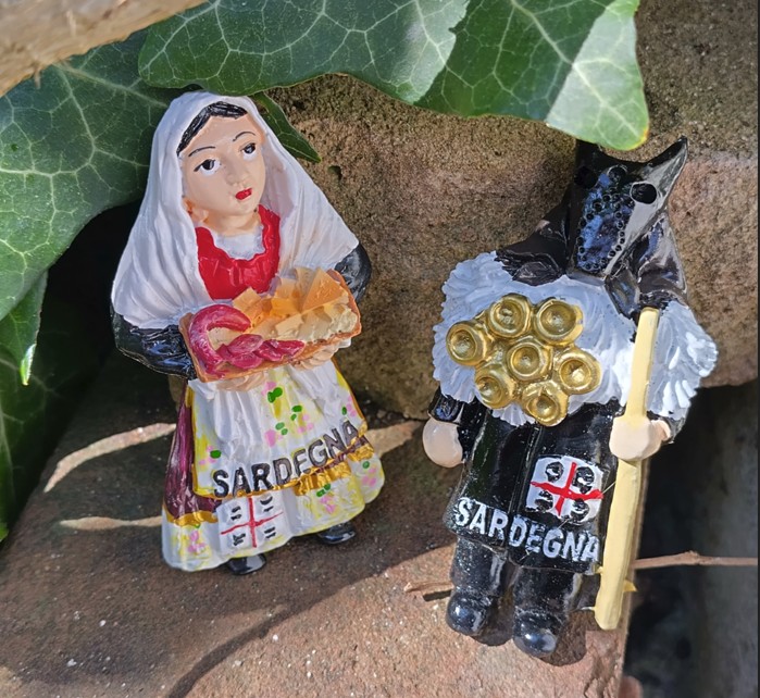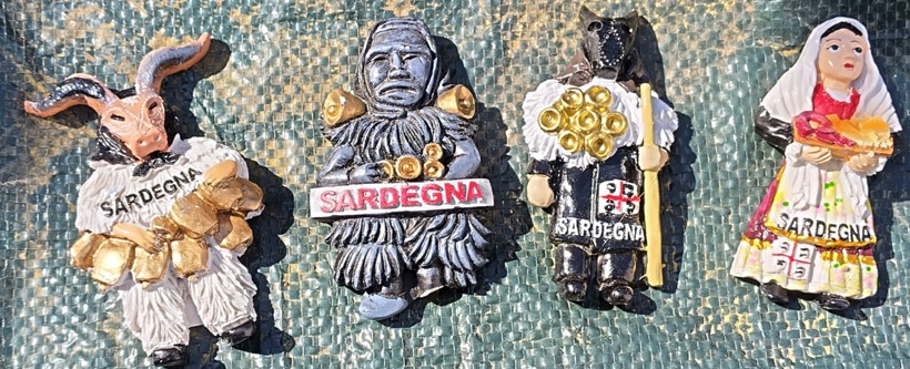 (Diverse magnets depicting Mamuthones and a Lady carrying a basket of bread.)