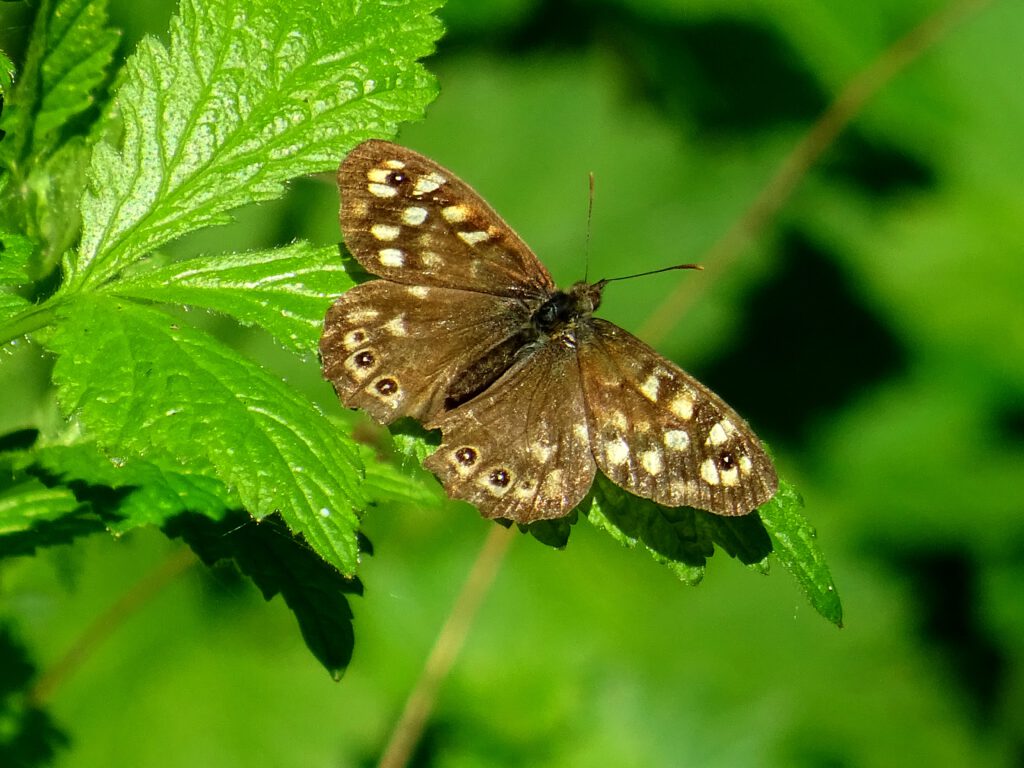 Verderop in het bos zijn mensen bezig met zaklampen en/of mobieltjes. Na mijn bezoek aan Boompje en B8 loop ik naar de groep mensen (jongelui) toe en vraag hen wat ze in het bos doen. Ze zijn (twee jongens en twee meisjes van rond de 20 jaar) aan het chillen. Ze drinken een drankje en lachen met elkaar. We hebben een leuk gesprek en zij vragen zich af wat ik in m’n eentje in het bos doe. Ik vertel hen dat ik graag een rondje bos maak in het donker en dat ik dat al jaren doe. Ze beloven de lege blikjes mee te nemen en we wensen elkaar een fijne avond. Mijn weg gaat een stukje terug en ik loop het brede pad van de populieren op. Een pad dat ik niet vaak heb genomen het afgelopen jaar. Ze zijn nog steeds bezig met de dijkverzwaring en veel is afgesloten, zo ook de weg naar de dijk. Dus na het populierenpad ga ik dwalend door het bos en kom in veel donkerder bos terecht 🙂 Ik kan nu alleen nog het mountainbikepad voor me zien liggen, dat is kaal en lichter dan het omringende gras. Dit is toch wel echt donker 🙂 Jammer dat hier geen bankje staat. Dit pad loop ik overdag graag omdat de bramen hier groeien en de libellen daar jagen! Prachtige plaatjes kan ik hier schieten. Het is zó anders in het donker. Als ik het donker uit ben en op het grindpad kom waar de herinneringsbomen staan, zie ik in de verte lichtjes branden bij de bomen. Zo mooi die zonne-energie lampjes! Bij de boom van mijn jammerlijk te vroeg overleden neefje hangt een tak met een lichtgevende volle maan in zich. Wat een prachtig gezicht is dit! De bloemen bij zijn boom kijk ik regelmatig na op uitgebloeide bloemen. In zijn leven kende ik hem niet, hij was afgedwaald van de familie. Of wij zijn dat… ook een optie. Regelmatig zie ik jongelui bij zijn boom, hij was fervent PEC Zwolle-aanhanger 🙂 en ze weten ‘hem’ te vinden!